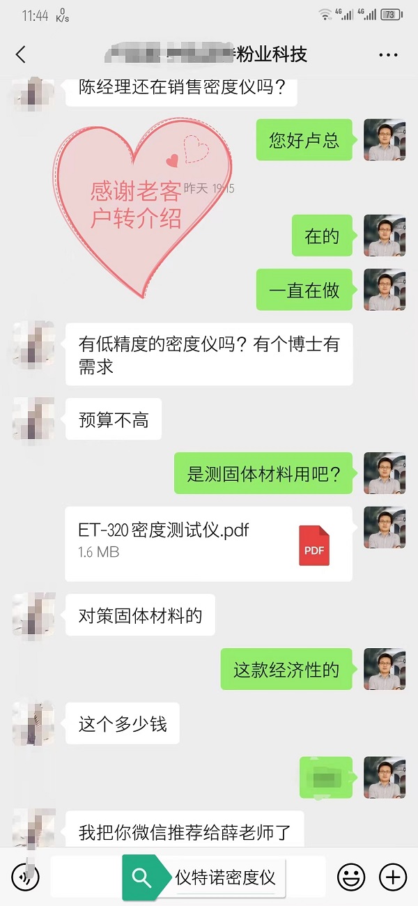 做業(yè)務,有客戶幫忙介紹生意,而且還是多年以后,這真是件幸福的事情,客戶之所以幫你推薦客戶,是因為對你產品質量的認可。每個人手上的資源都不多,能給介紹客戶資源,這是絕對的真愛,也是對你產品和人品認可后的動作。這種來之不易的幸福,能夠激勵我們持續(xù)做好密度儀的品質和服務。