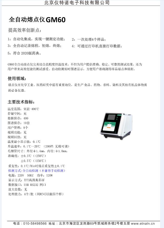 • 產品簡介:全自動熔點儀GM60結合高精度控溫技術,不但為用戶提供準確、穩定、可靠的測試結果,還為 用戶帶來高效便捷的測試感受。自動檢測實時圖譜顯示,方便用戶準確測得樣品熔點和熔距。